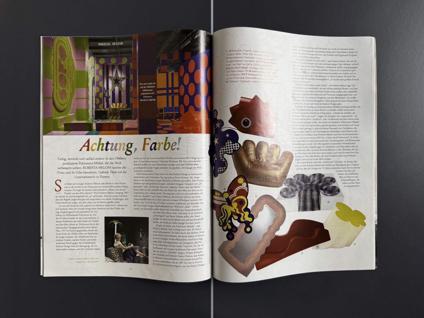 A selection of Poltronova furniture is featured in an in-depth article published by the German magazine “Icon”, focusing on the history and legacy of Italian Radical Design. The feature traces the pivotal role played by the Florence-based company during the 1960s and 1970s, when it became a key platform for radical experimentation, challenging the conventions of function, form, and modernist aesthetics. Through some of its most iconic projects, the article highlights Poltronova’s unconventional vision and its lasting contribution to a provocative and forward-thinking design culture.