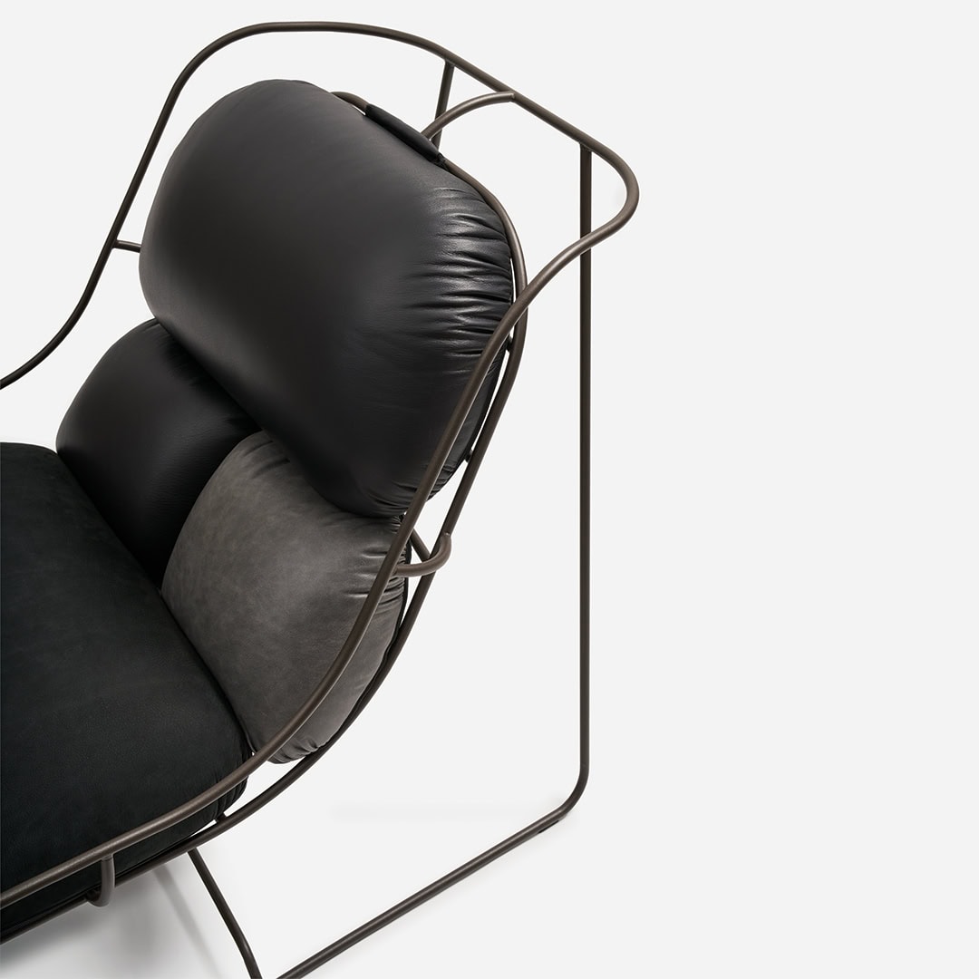 In the context of Nigel Coates’ growing interest in furniture, the Plasma armchair reflects the English designer’s taste for designing essential forms by digital means. Composed of a set of cushions in different tones placed on a slender metal structure with harmonious curves, Plasma combines the simplicity of a continuous graphic sign with the complex technology of the structure, made with computerized methods of bending and welding. With a footrest, it is also available for outdoor use.